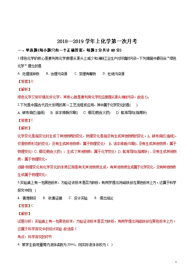 精品解析:山东省宁津县育新中学2019届九年级上学期第一次月考化学试题(word版含答案解析)