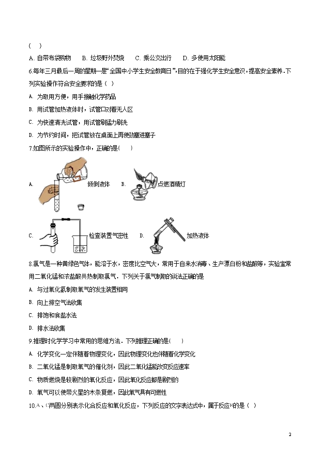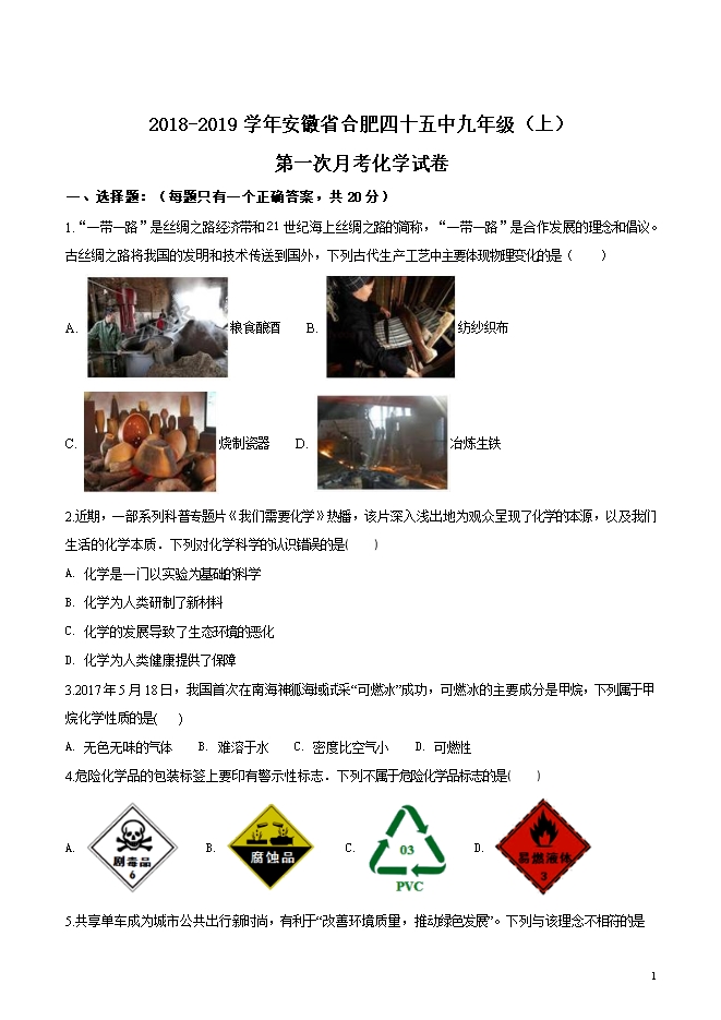 安徽省合肥四十五中2018-2019学年九年级第一次月考化学试题(word版无答案)