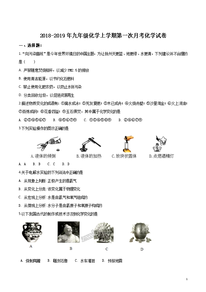 【内容简介】江苏省高邮市阳光双语初中2019届九年级上学期第一次月考化学试题(word版无答案)