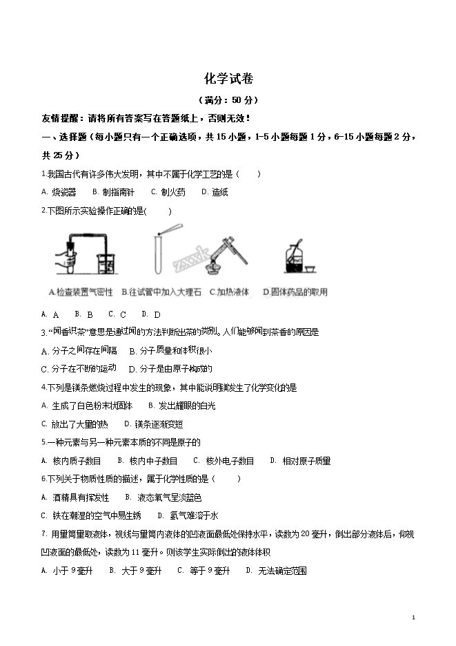 江苏省灌南县华侨外国语学校2019届九年级上学期第一次月考化学试题(word版无答案)