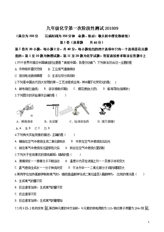 【内容简介】江苏省海安县2019届九年级上学期第一次阶段测试理科综合化学试题(word版无答案)