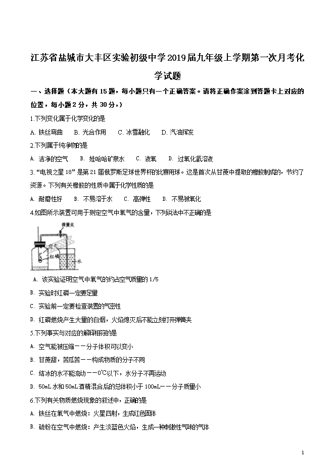 【内容简介】江苏省盐城市大丰区实验初级中学2019届九年级上学期第一次月考化学试题(word版无答案)