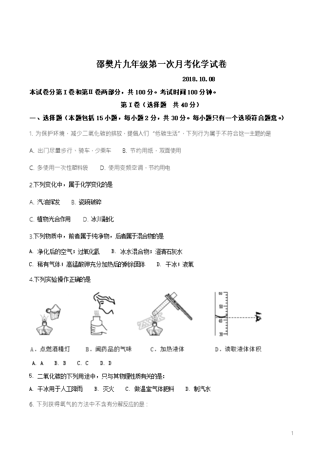 【内容简介】江苏省扬州市江都区邵樊片2019届九年级上学期第一次月考化学试题(word版无答案)