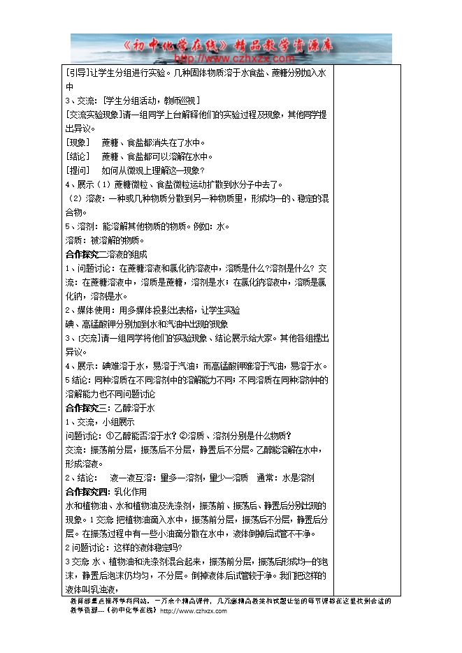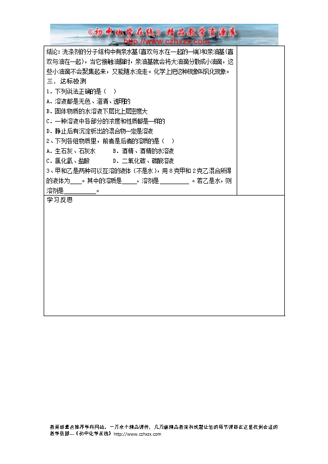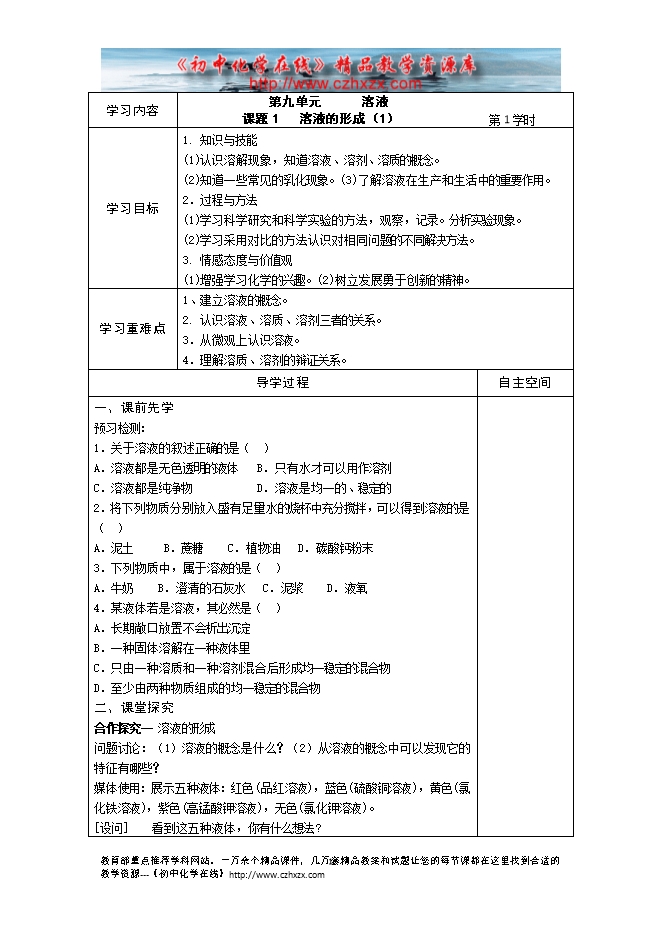 人教版初中化学《第九单元课题1 溶液的形成》导学案(一)
