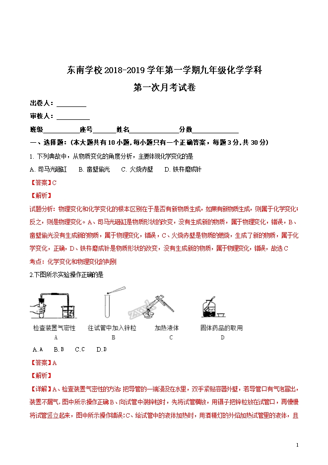 精品解析:福建省闽侯县东南学校2019届九年级上学期第一次月考化学试题(word版含答案解析)