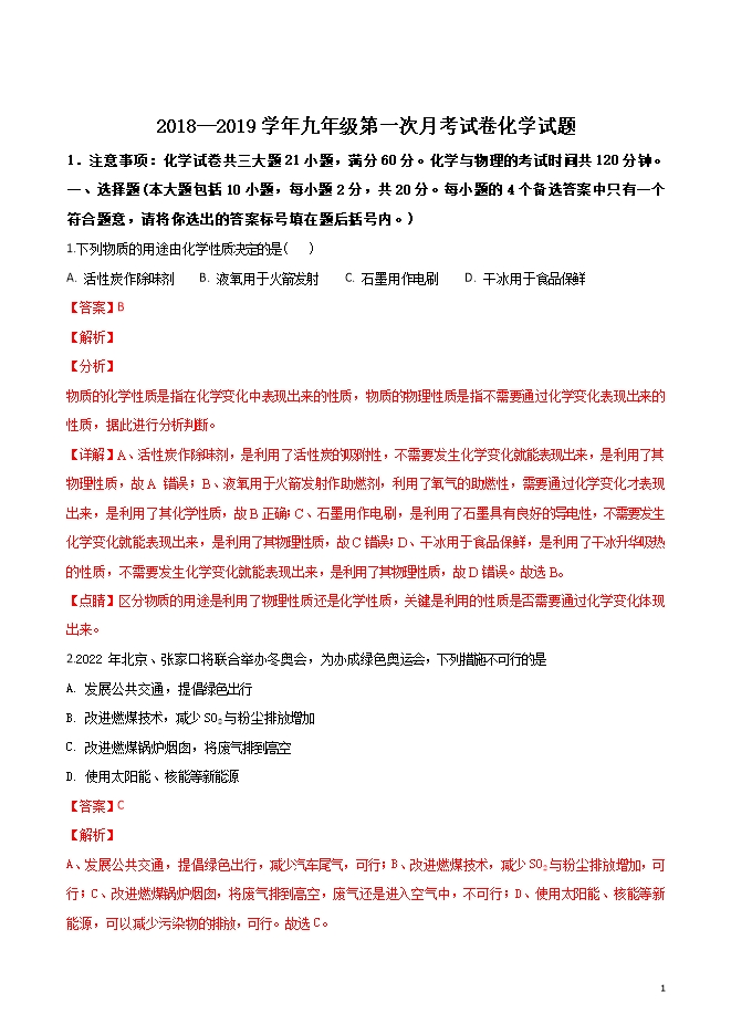 精品解析:安徽省阜阳市第九中学2019届九年级上学期第一次月考化学试题(word版含答案解析)