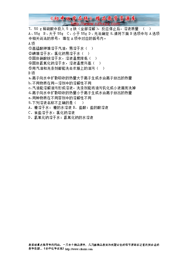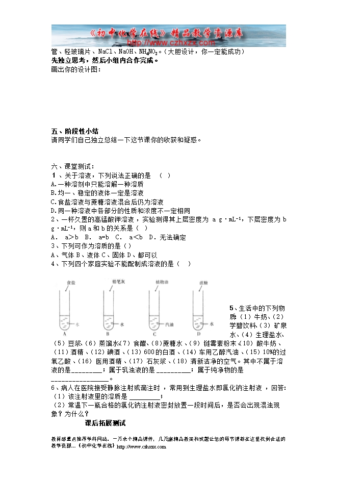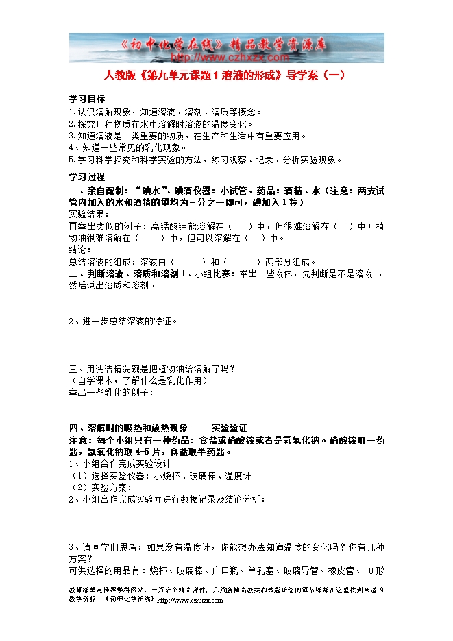 人教版初中化学《第九单元课题1 溶液的形成》导学案(二)