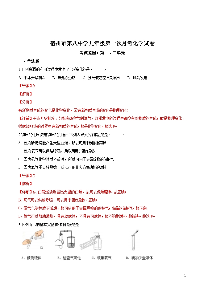 精品解析:安徽省宿州市第八中学201届九年级上学期第一次月考化学试题(word版含答案解析)