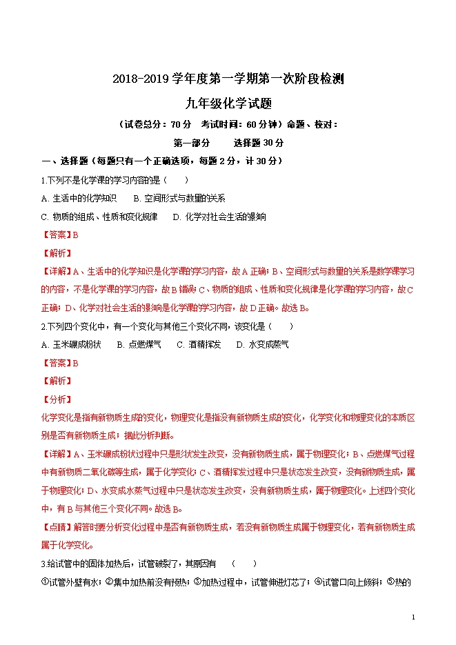 精品解析:江苏省东台市第三联盟2018-2019学年九年级上学期第一次月考化学试题(word版含答案解析)