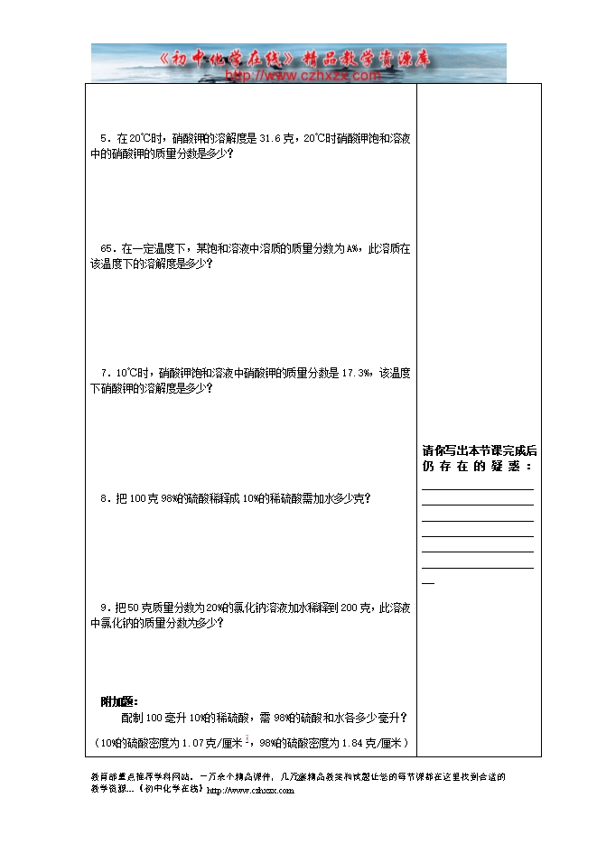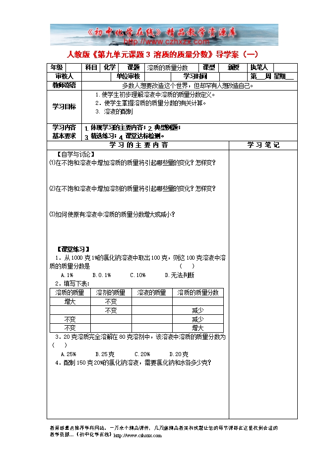 人教版初中化学《第九单元课题3 溶液的浓度》导学案(二)