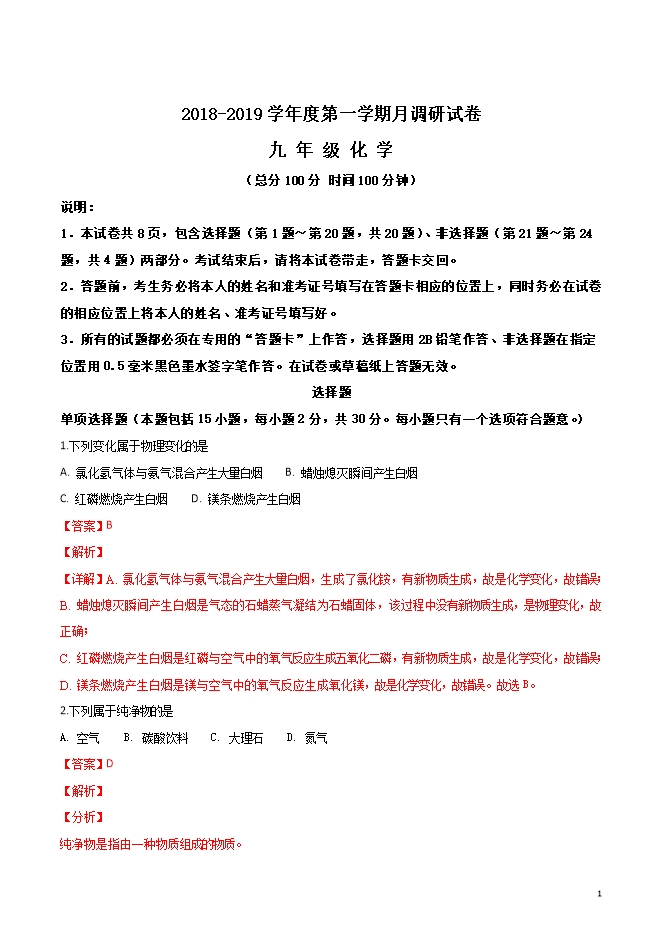 精品解析:江苏省扬州市邗江实验学校2019届九年级上学期第一次月考化学试题(word版含答案解析)