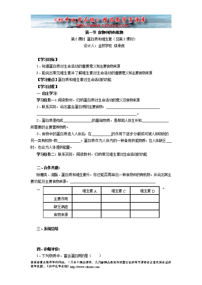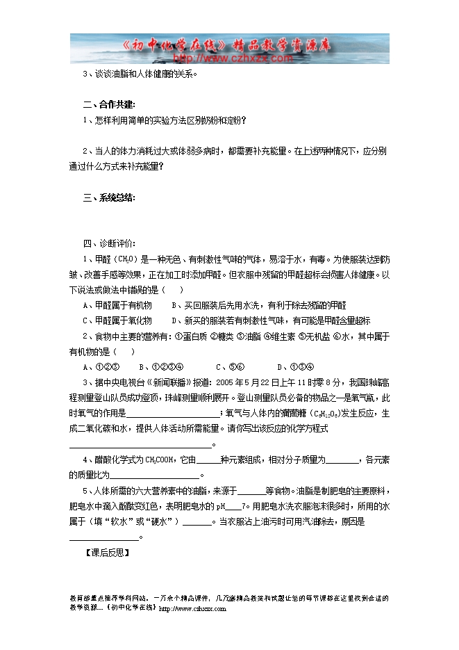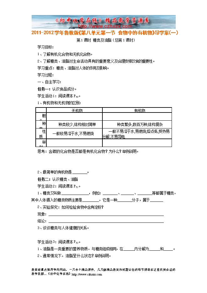 2011-2012学年鲁教版《第十章第一节 食物中的有机物》导学案(一)