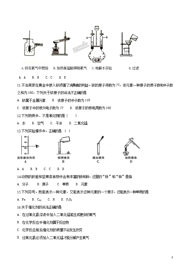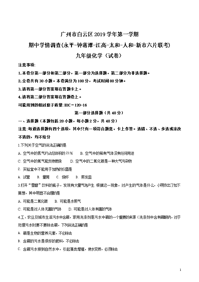 广东省广州市白云区2019届九年级第一学期期中考试(六片联考)化学试题(word版无答案)