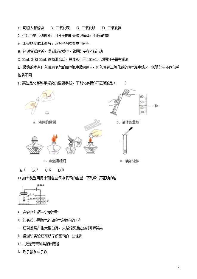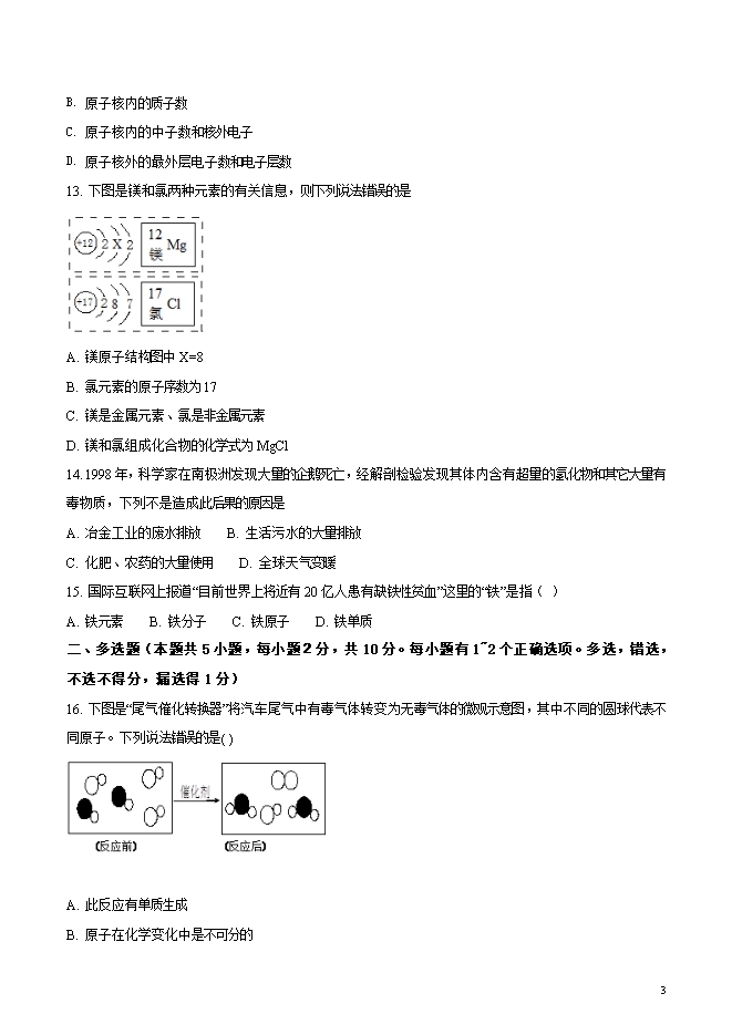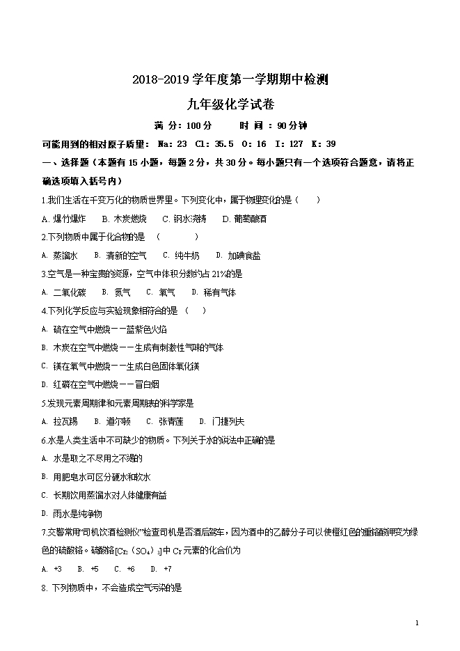 所属专辑: 《2019届九年级上学期期中考试化学试题汇总》专辑