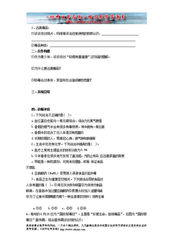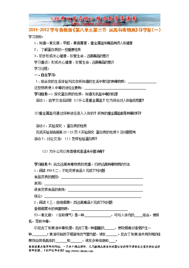 2011-2012学年鲁教版《第十章第三节 远离有毒物质》导学案(一)
