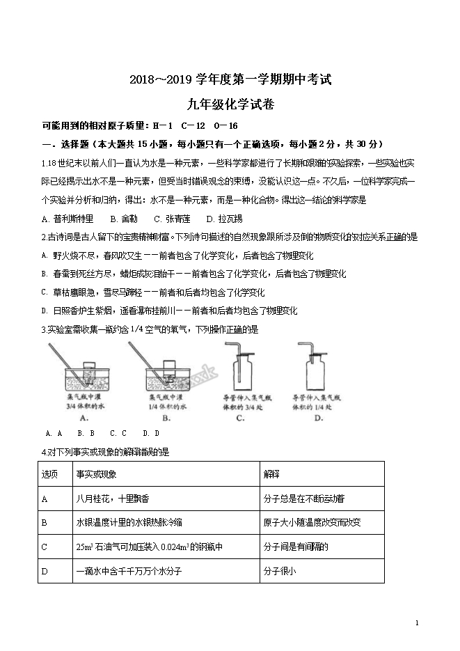 【内容简介】江苏省东台市第二联盟2019届九年级上学期期中考试化学试题(word版无答案)