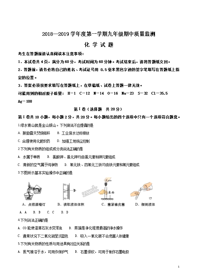 【内容简介】江苏省南通市如皋市2019届九年级第一学期期中考试化学试题(word版无答案)