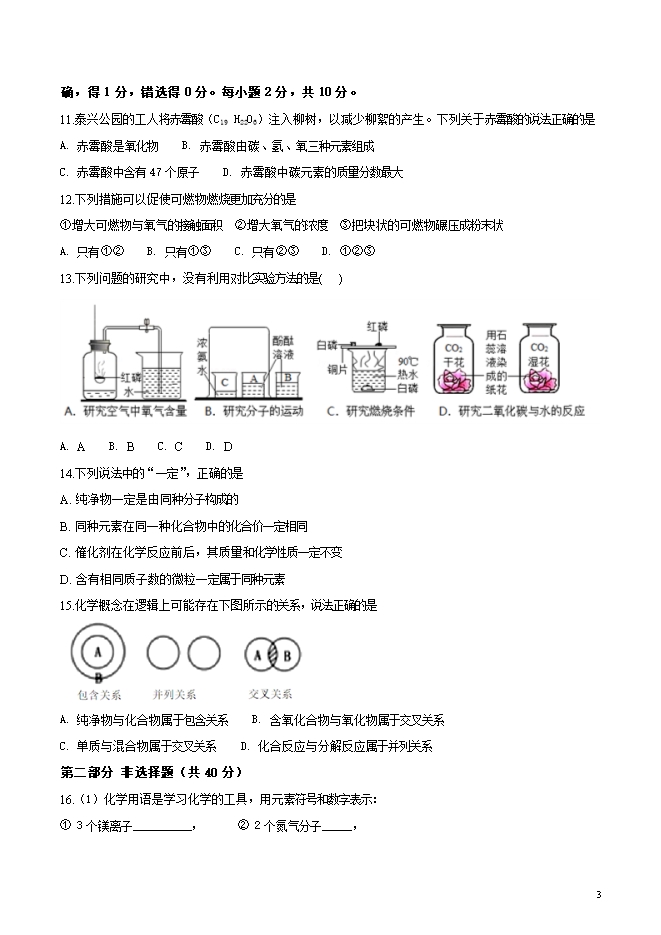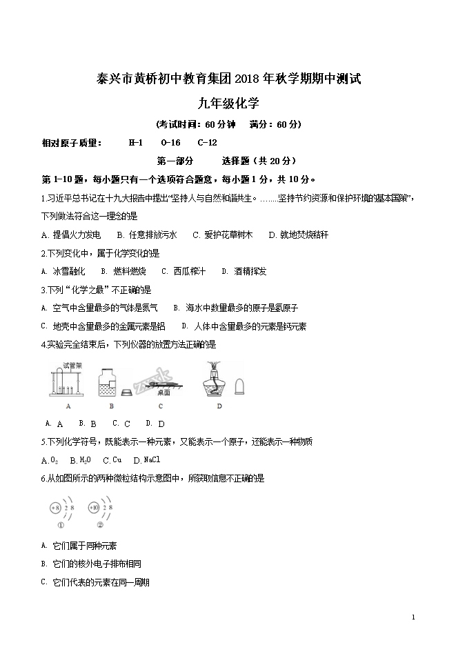 【内容简介】江苏省泰兴市黄桥东区域2019届九年级上学期期中考试化学试题(word版无答案)