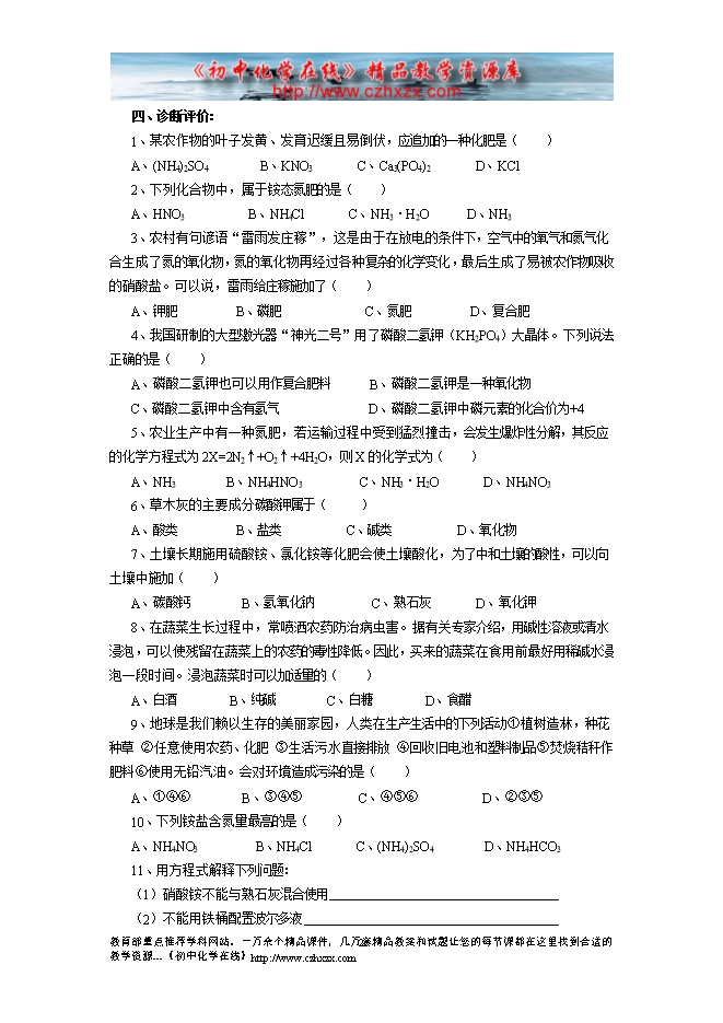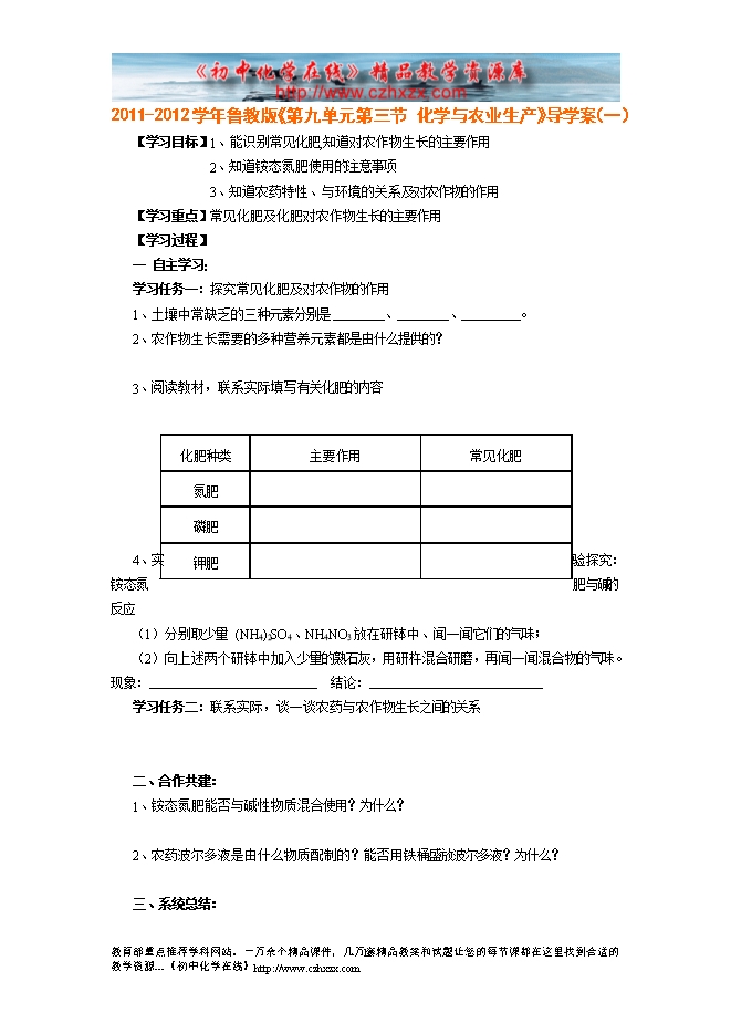 2011-2012学年鲁教版《第十一章第三节 化学与农业生产》导学案(一)