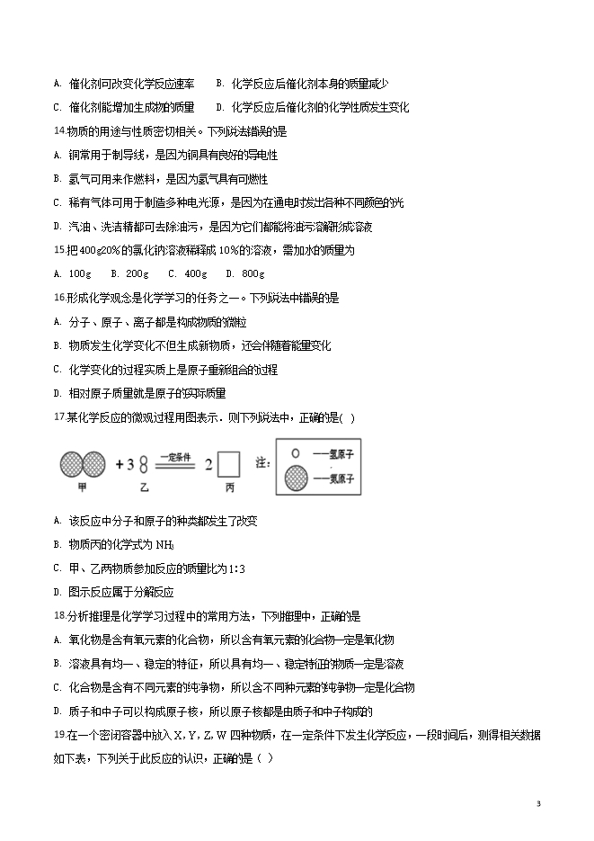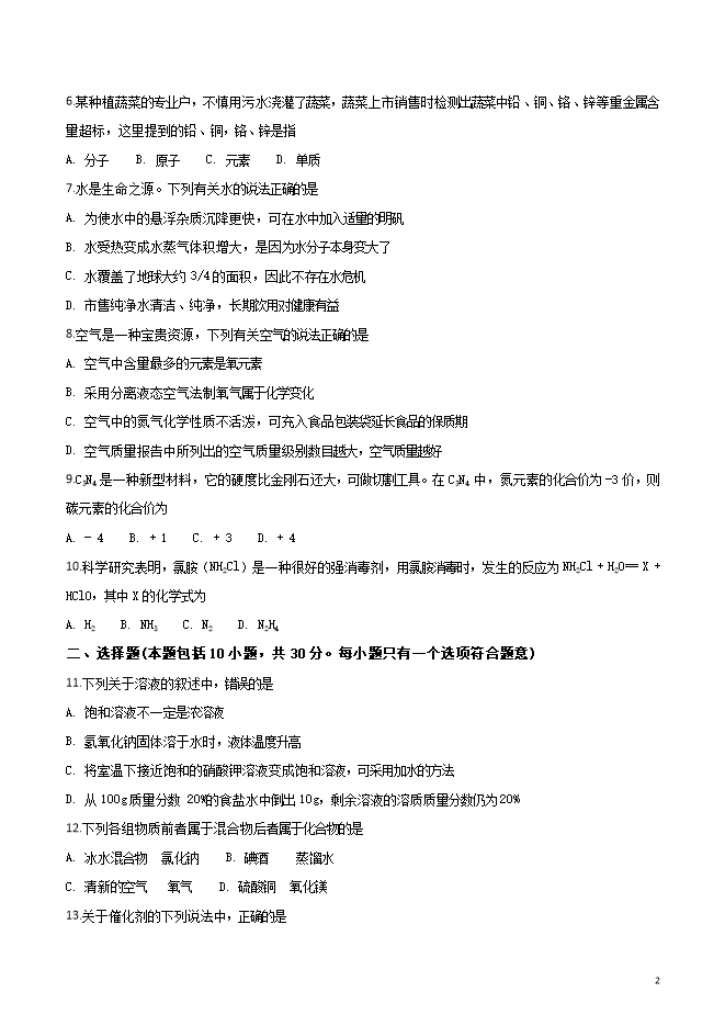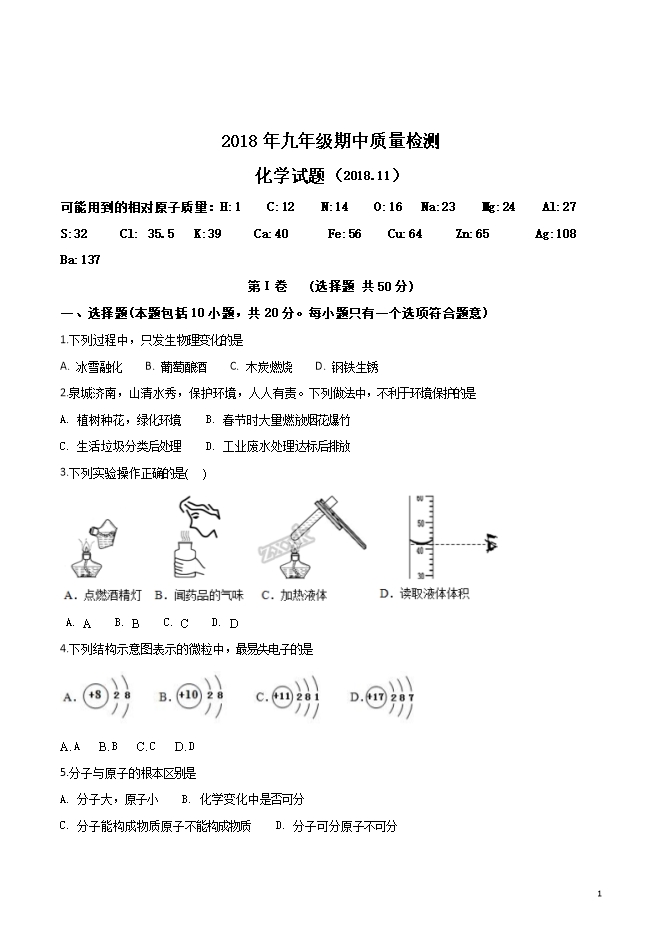 山东省济南市槐荫区2019届九年级上学期期中考试化学试题(word版无答案)