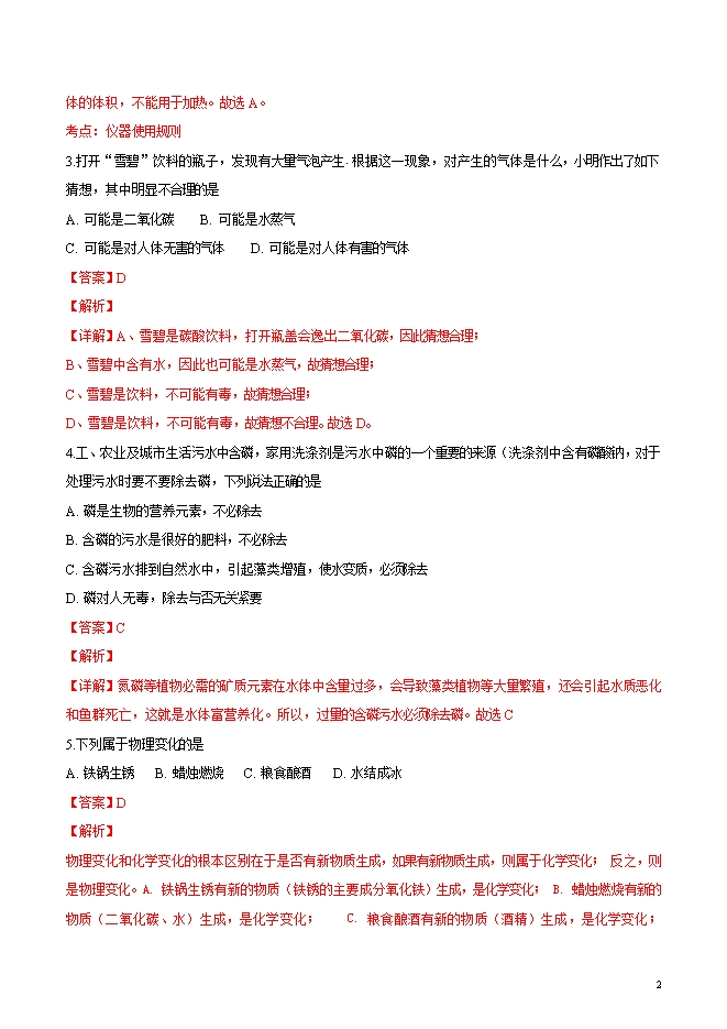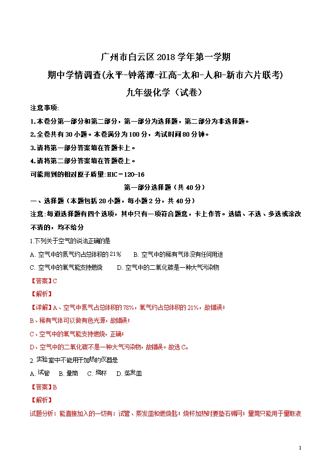 精品解析:广东省广州市白云区2019届九年级第一学期期中考试(六片联考)化学试题(word版含答案解析)