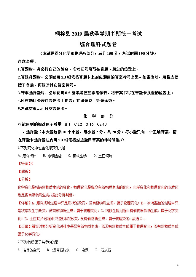 精品解析:贵州省遵义市桐梓县2019届九年级上学期期中(半期)考试化学试题(word版含答案解析)