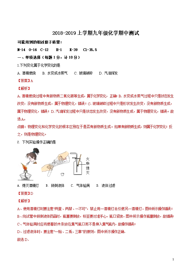 精品解析:湖北省南漳县龙门中学2019届九年级上学期期中测试化学试题(word版含答案解析)