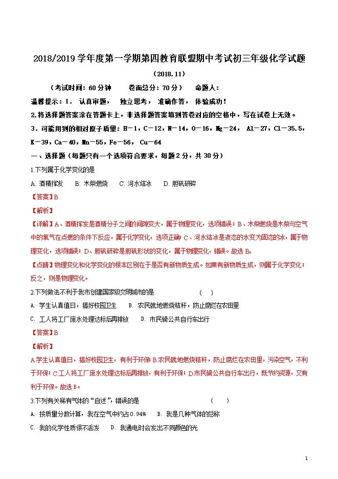 精品解析:江苏省东台市2019届九年级上学期期中考试化学试题(word版含答案解析)