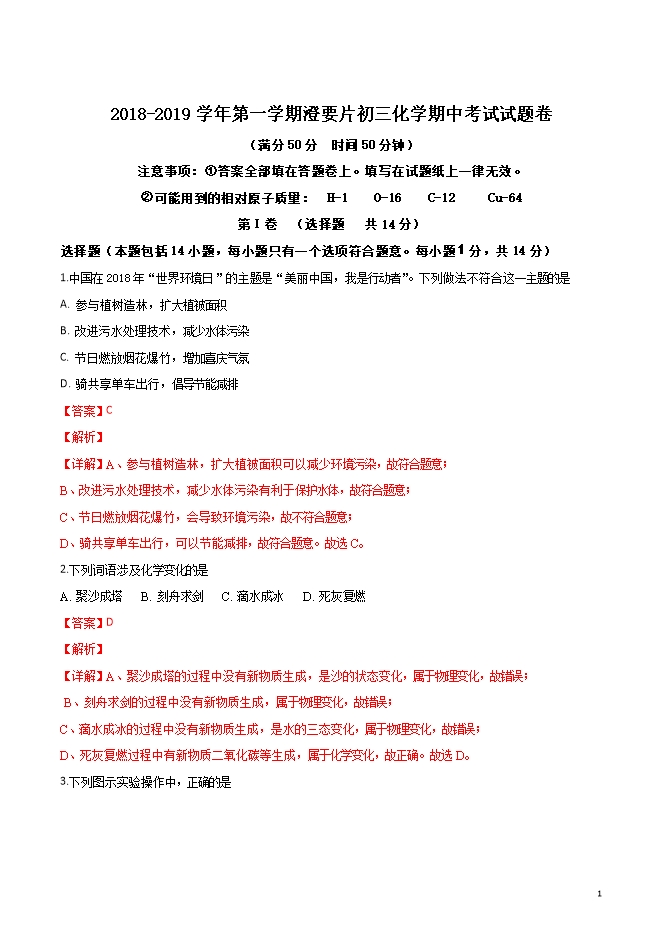 精品解析:江苏省江阴市澄要片2019届九年级上学期期中考试化学试题(word版含答案解析)