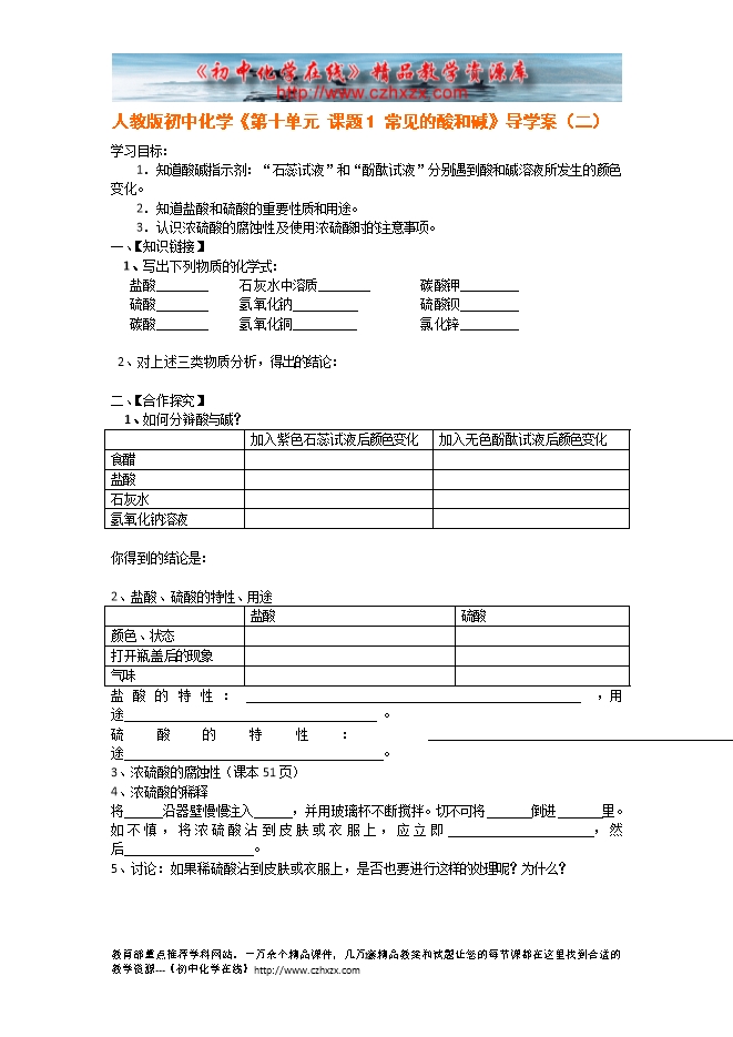 人教版初中化学《第十单元 课题1 常见的酸和碱》导学案(二)