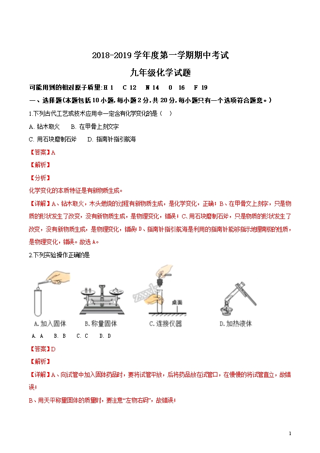 精品解析:山东省菏泽市东明县2019届九年级第一学期期中考试化学试题(word版含答案解析)