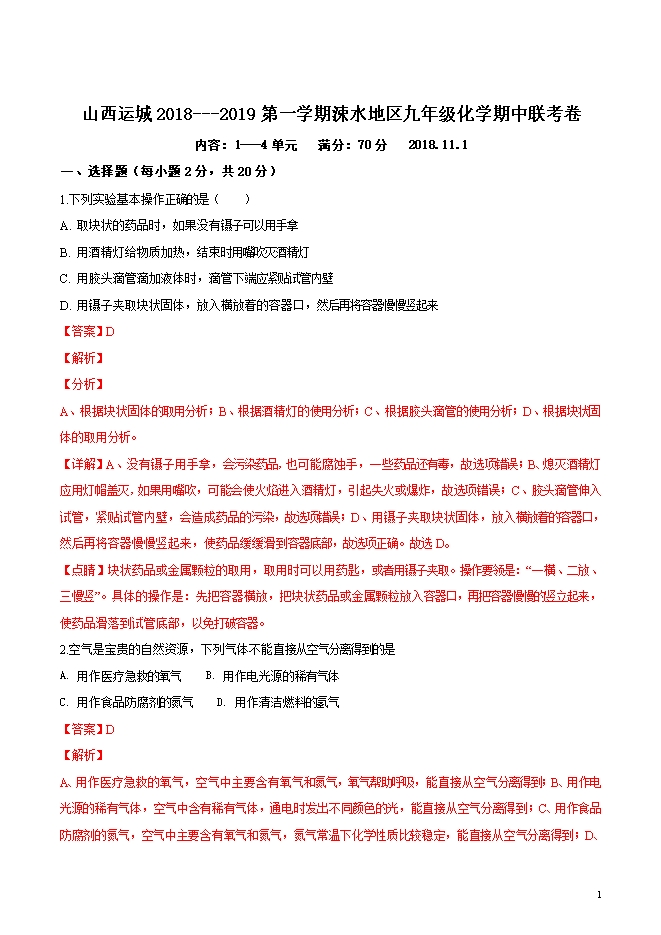 精品解析:山西省运城市涑水地区2019届九年级第一学期期中联考化学试题(word版含答案解析)