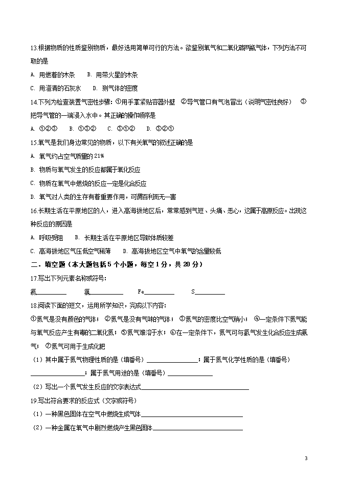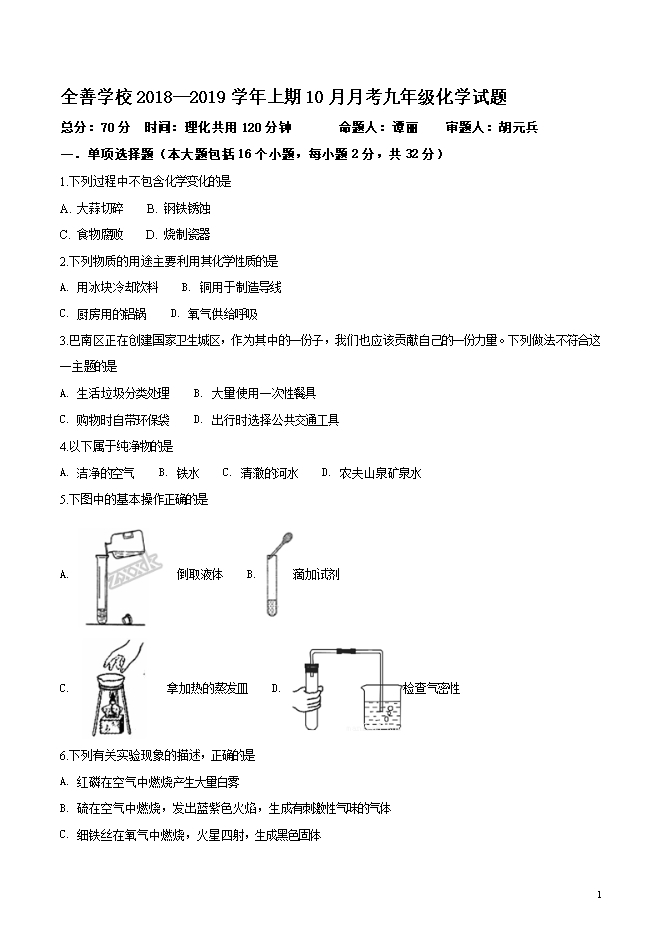 【内容简介】重庆市巴南区全善中学2019届九年级上学期10月月考化学试题(word版无答案)