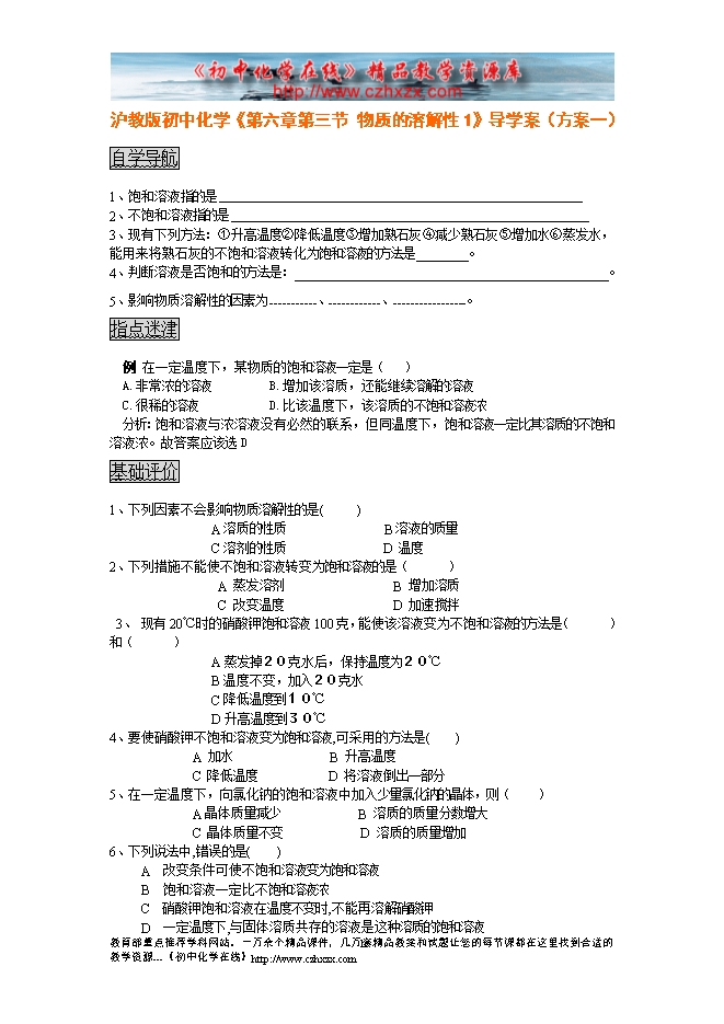 沪教版初中化学《第六章第三节 物质的溶解性1》导学案(方案一)