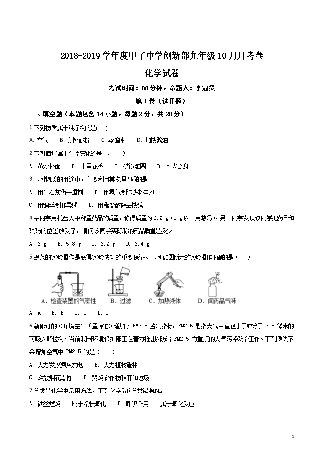 【内容简介】广东省陆丰市甲子中学创新部2019届九年级上学期10月月考化学试题(word版无答案)