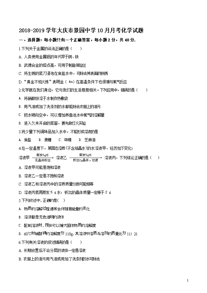 【内容简介】黑龙江省大庆市景园中学2019届九年级上学期10月月考化学试题(word版无答案)