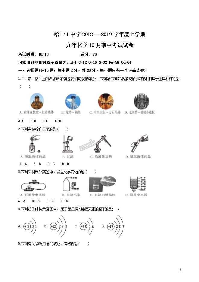 【内容简介】黑龙江省哈尔滨市141中学2019届九年级上学期10月月考化学试题(word版无答案)