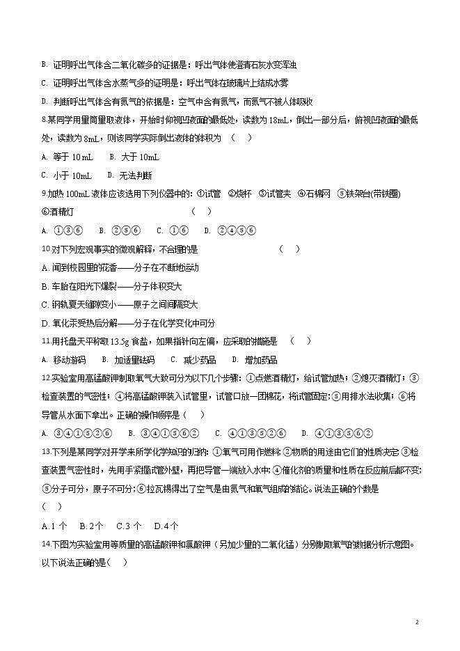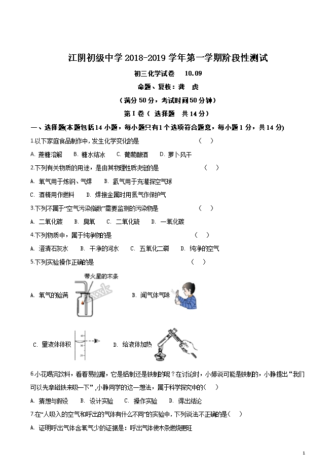 【内容简介】江苏省江阴初级中学2019届九年级上学期10月月考化学试题(word版无答案)