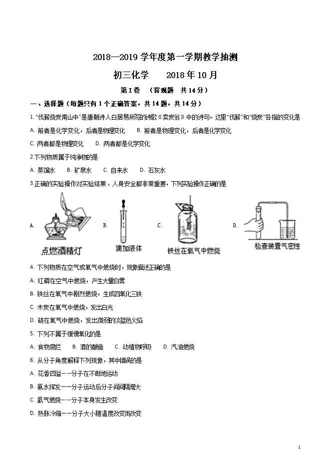 【内容简介】江苏省南菁高级中学实验学校2019届九年级上学期10月教学质量抽测化学试题(word版无答案)