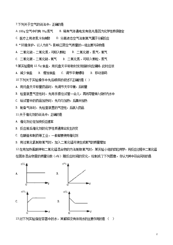 江苏省南菁高级中学实验学校2019届九年级上学期10月教学质量抽测化学试题(word版无答案)