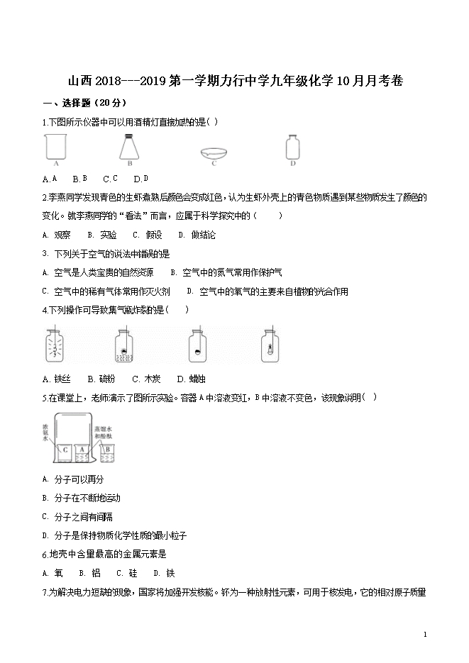 【内容简介】山西省运城市力行中学2019届九年级第一学期10月月考化学试题(word版无答案)