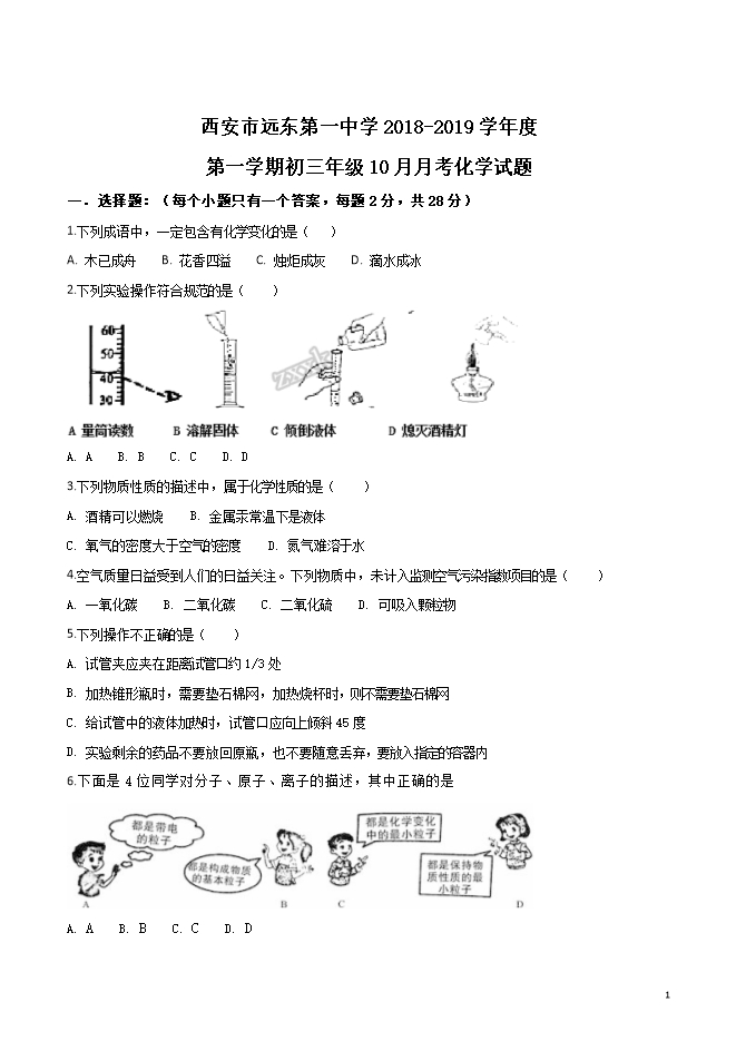 【内容简介】陕西省西安市远东第一中学2019届九年级上学期10月月考化学试题(word版无答案)