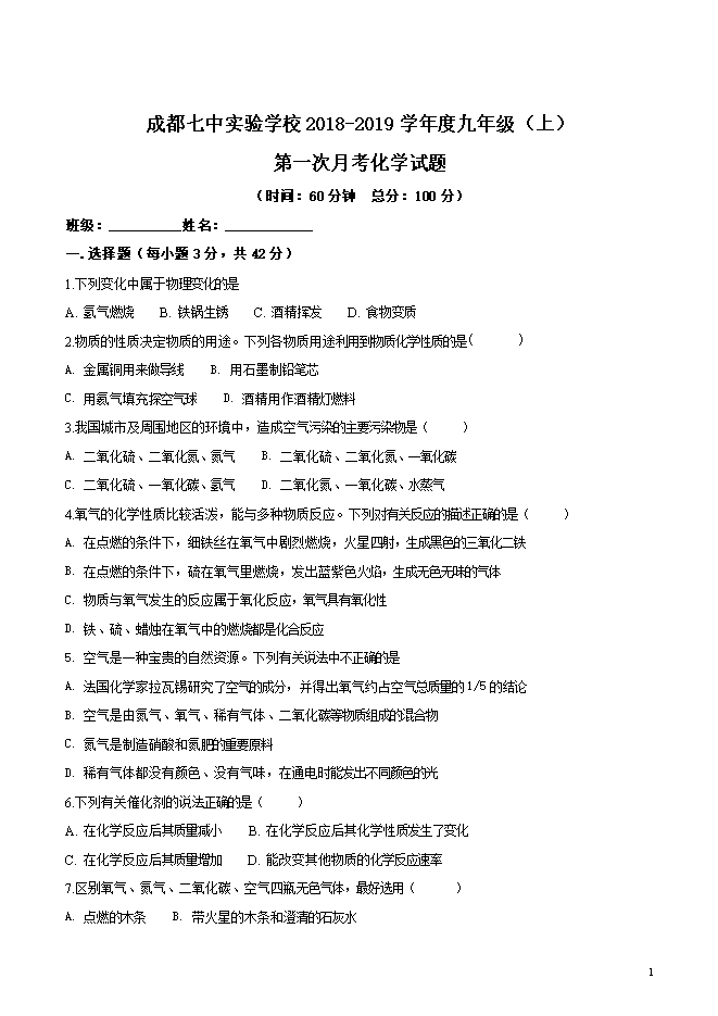 【内容简介】四川省成都七中实验学校2019届九年级10月月考化学试题(word版无答案)