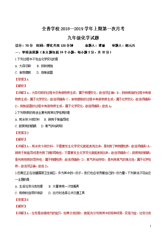 【内容简介】精品解析:重庆市巴南区全善中学2019届九年级上学期10月月考化学试题(word版含答案解析)