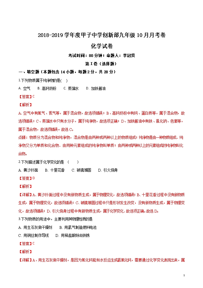 精品解析:广东省陆丰市甲子中学创新部2019届九年级上学期10月月考化学试题(word版含答案解析)
