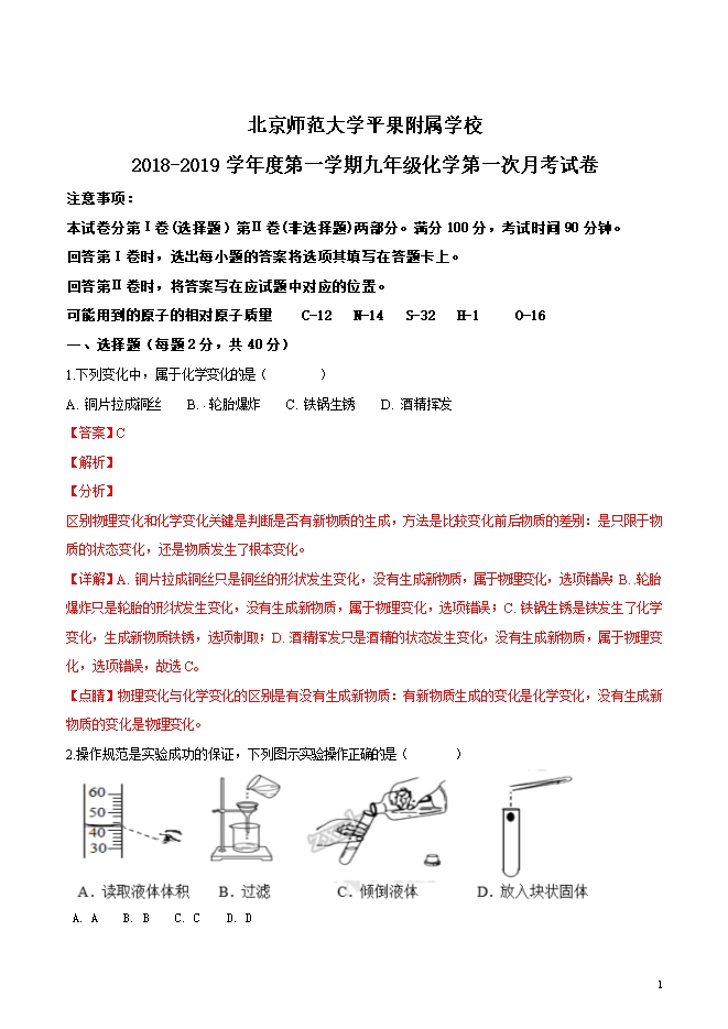 精品解析:广西壮族自治区北京师范大学平果附属学校2019届九年级上学期10月月考化学试题(word版含答案解析)