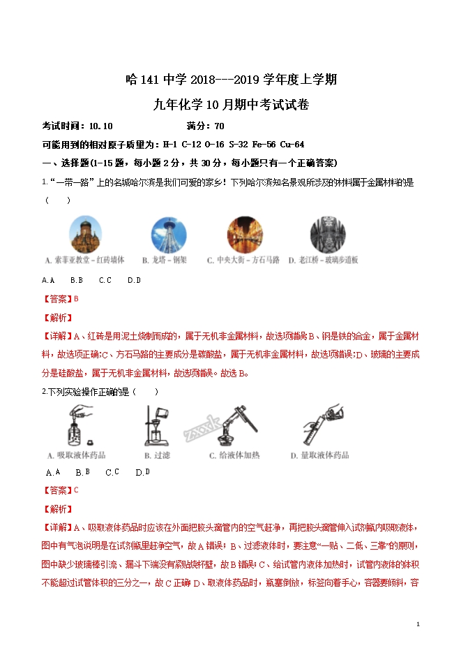 【内容简介】精品解析:黑龙江省哈尔滨市141中学2019届九年级上学期10月月考化学试题(word版含答案解析)