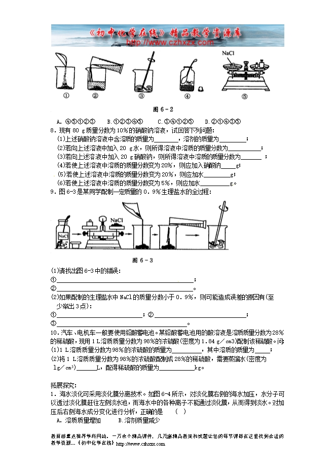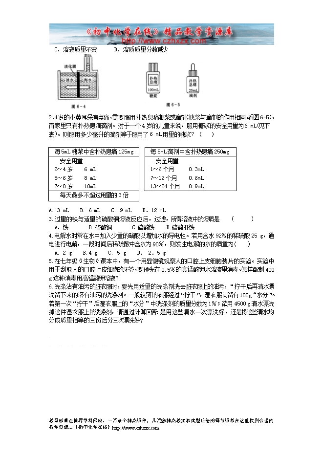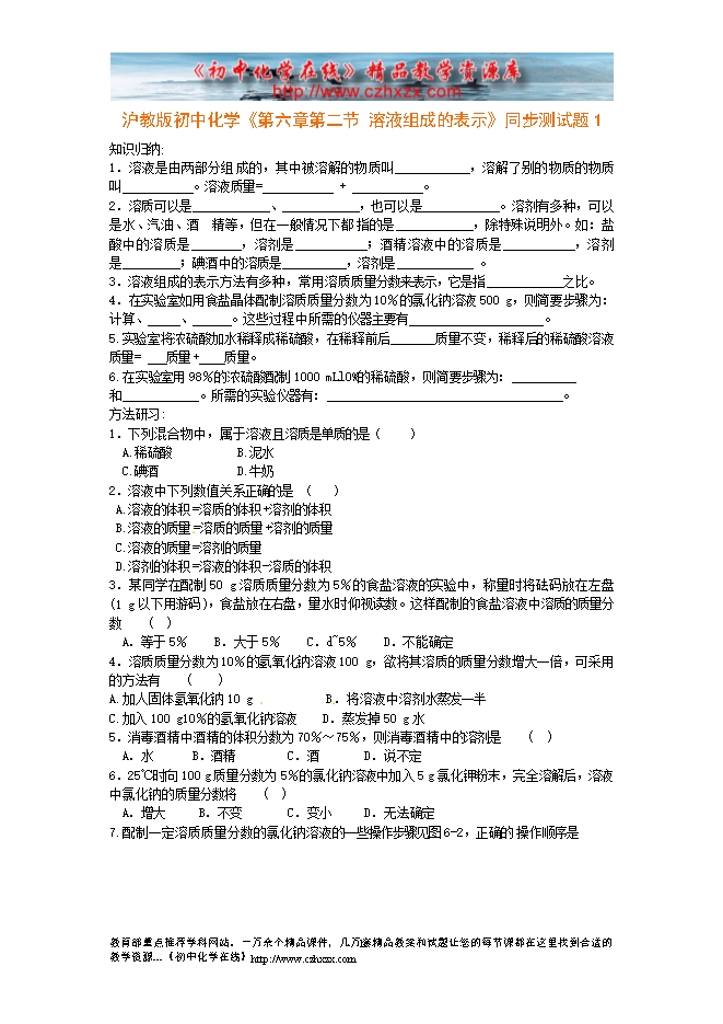 沪教版初中化学《第六章第二节 溶液组成的表示》同步测试题1