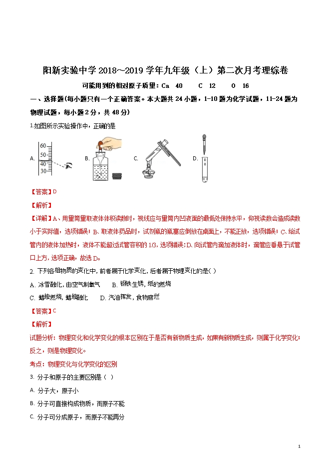 【内容简介】精品解析:湖北省阳新实验中学2019届九年级上学期第二次月考理科综合化学试题(word版含答案解析)