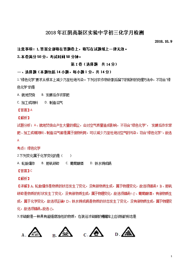 精品解析:江苏省江阴市高新区山观实验中学2019届九年级上学期10月月考化学试题(word版含答案解析)